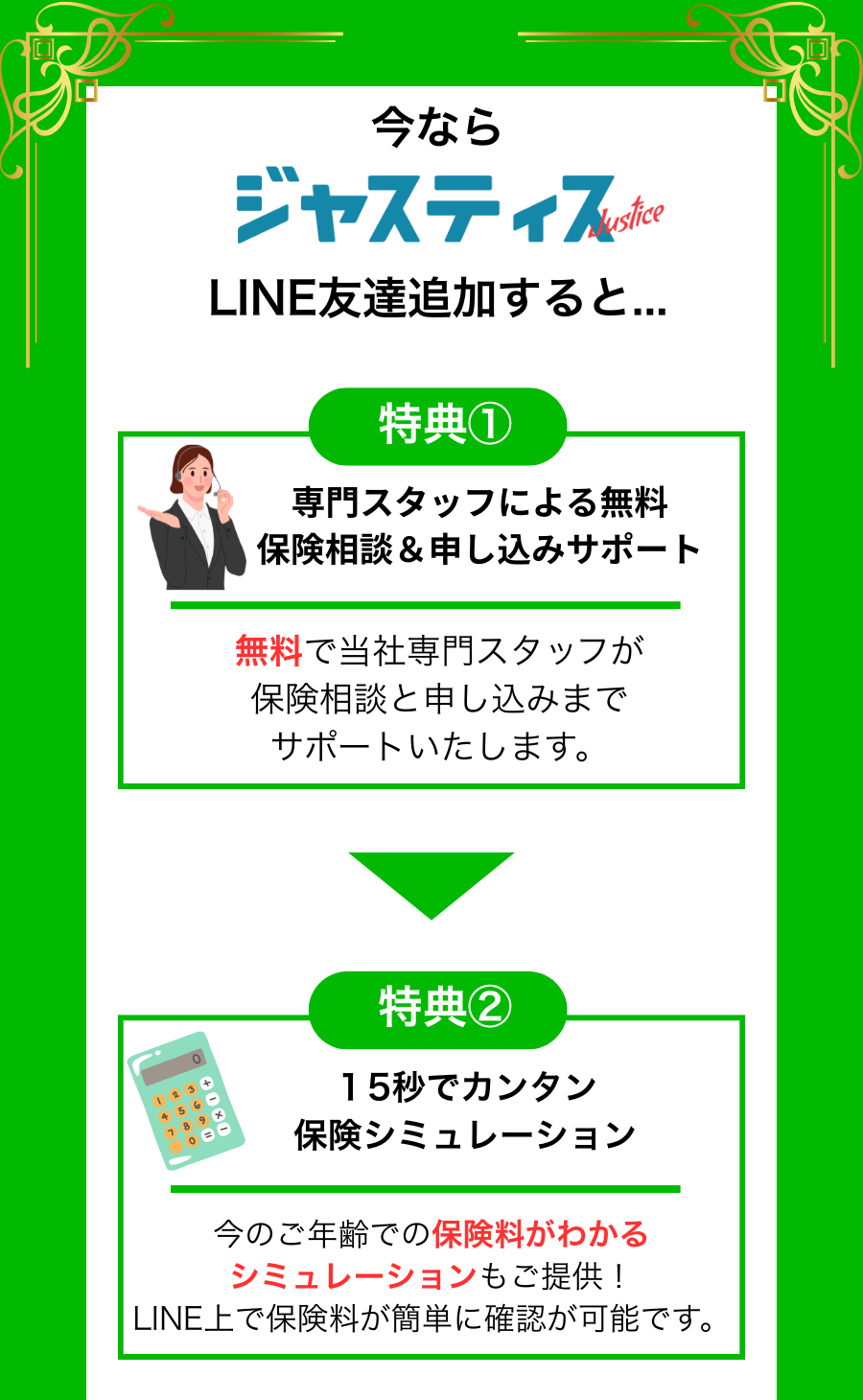 LINE登録者様限定で、保険相談からジャスティス申込までLINEやお電話で完全サポートさせて頂きます。