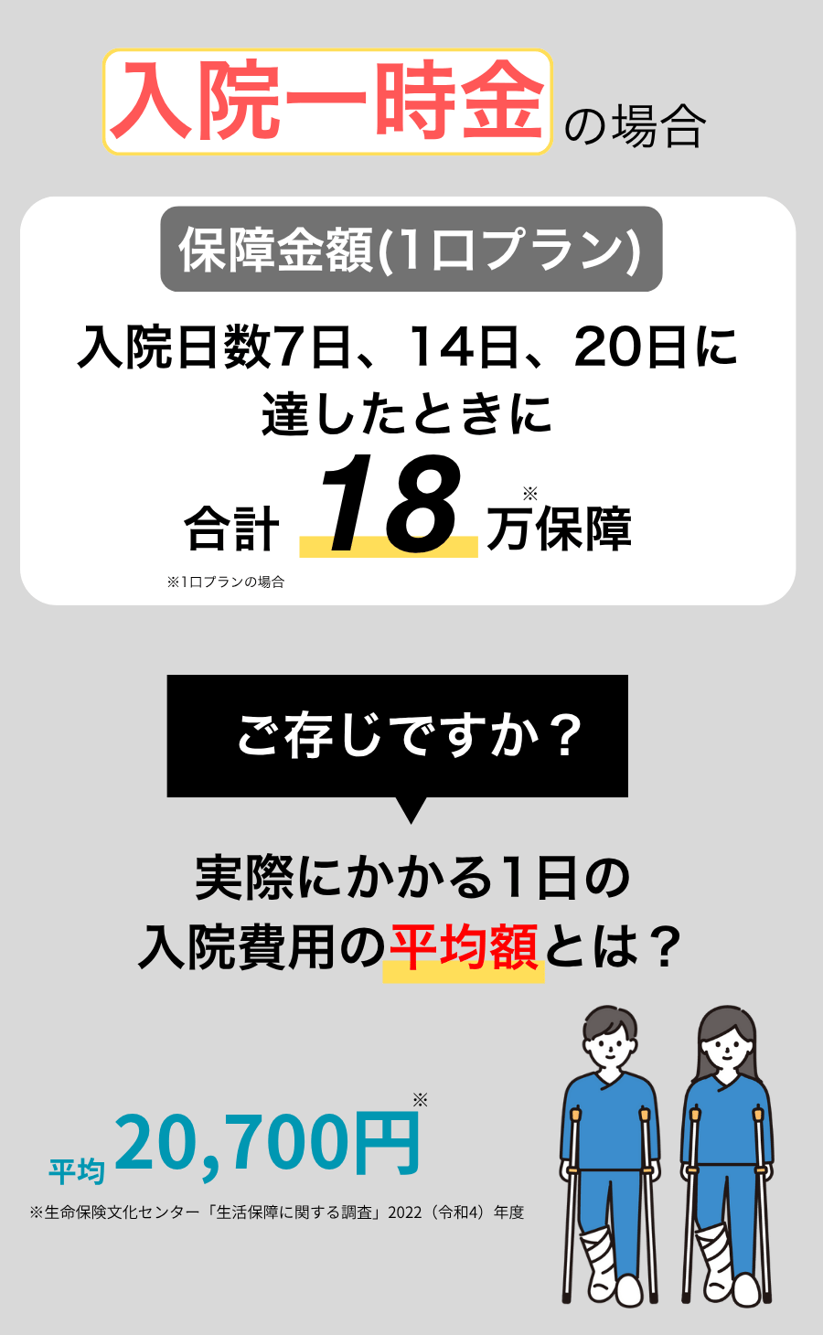 病気やケガの治療を目的とした入院について、1回の入院日数が7日、14日、20日に達した際に6万円ずつお支払いいたします。