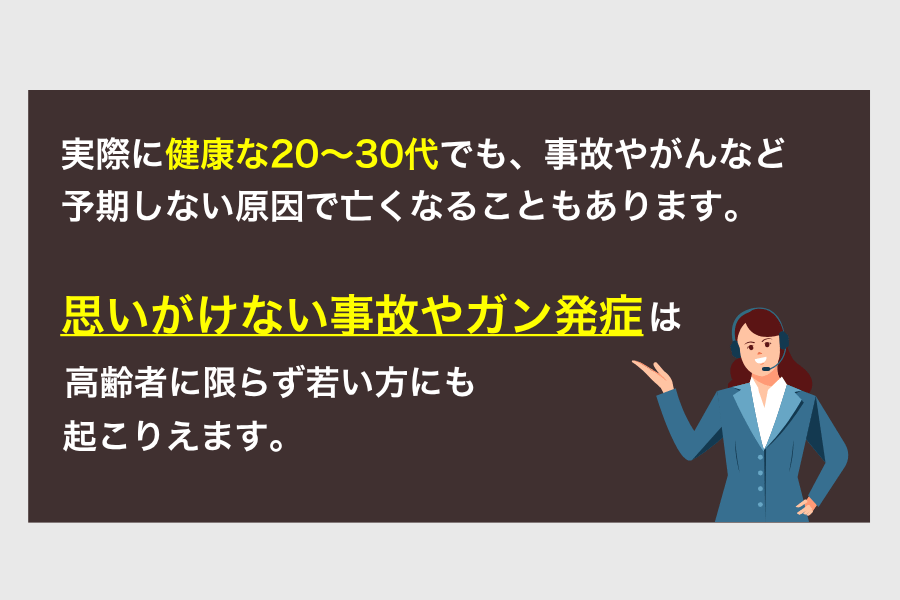 不慮の事故による傷害を直接の原因として、お亡くなりになった際にお支払いいたします。